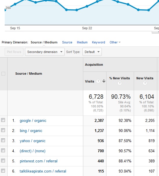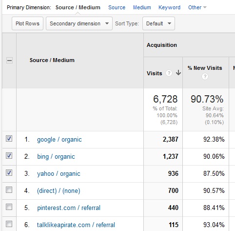 The specific data here is not surprising: we know that Google sends the most search traffic. However, you can use this technique to check on many things. For example, we found that visits from some public school districts are on different schedules from others; it would be hard to see this information without teasing out the strands of data in this way, and the information can affect our blogging schedule.